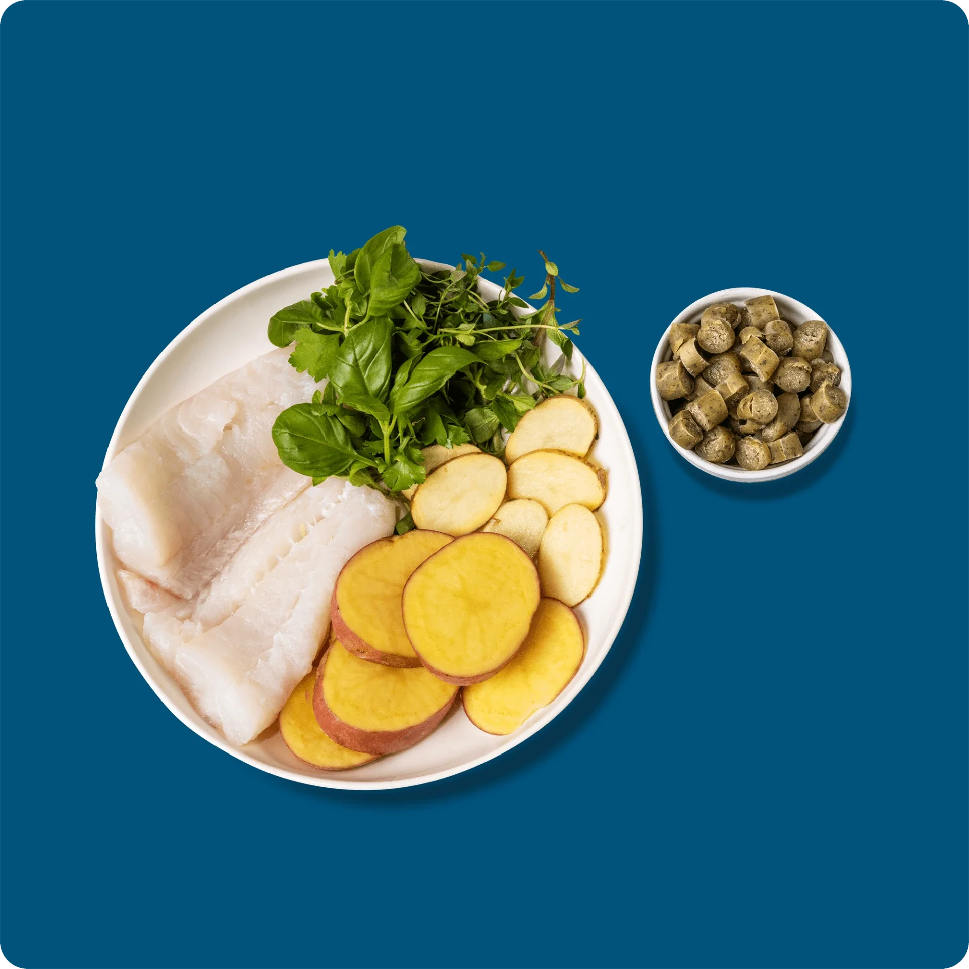 Ingredients: 70% whitefish, potato, vegetable, glycerol, basil, botanical herb mix (including marjoram, thyme, parsley, and oregano), preservative.